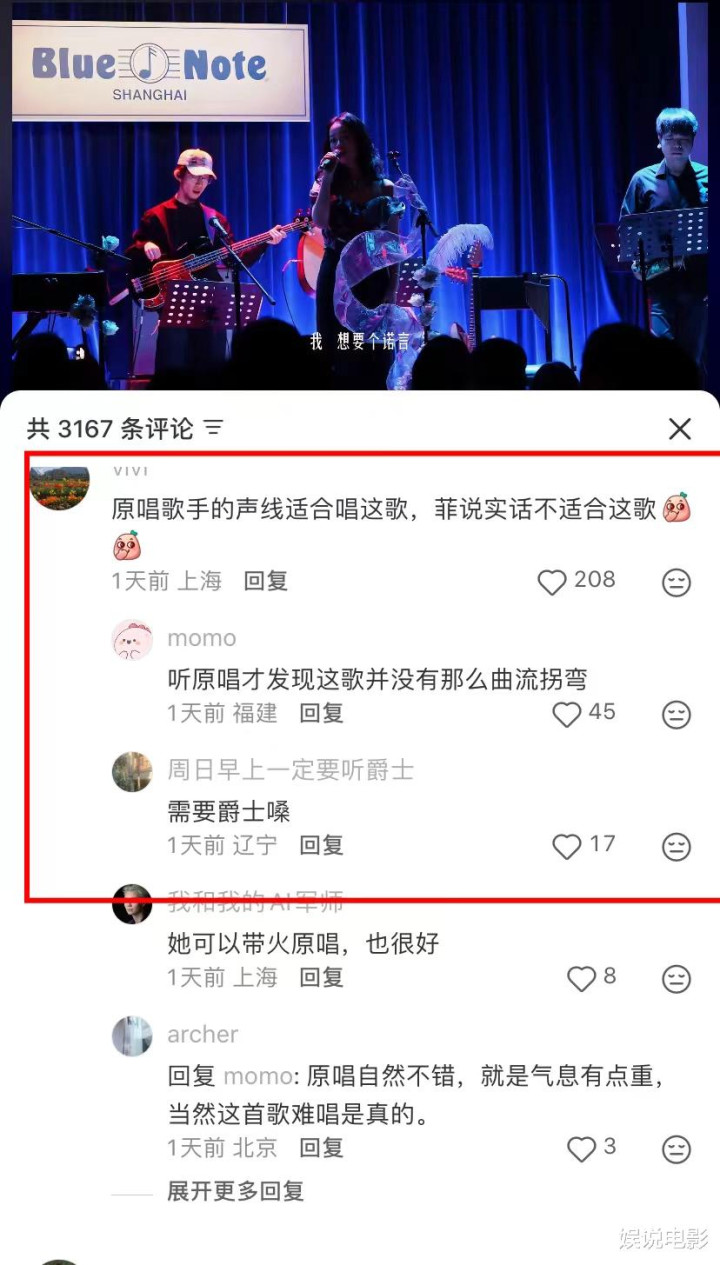 乐评人爱地人点评也是不认可王菲的版本,她没唱好,不是王菲水平的表现,她在唱法和语调上借用原唱的方法,但她的音域又呈现不了原唱的风格,所以有点不伦不类,如果进行有效改编,可能才会燃爆。